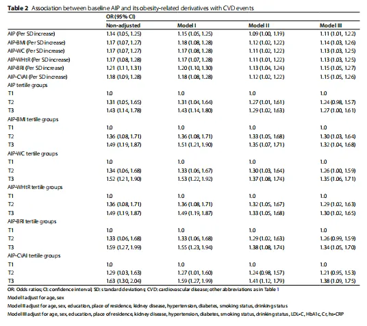 表2 基线AIP及其肥胖相关衍生指标与 CVD 事件之间的关联性