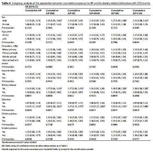 表4 AIP及其肥胖相关衍生物的累积暴露量与 CVD 事件关联性的亚组分析