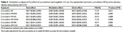 中介分析显示,累积HbA1c部分介导了累积AIP及其肥胖相关衍生物与CVD的关联,中介比例约为11%。