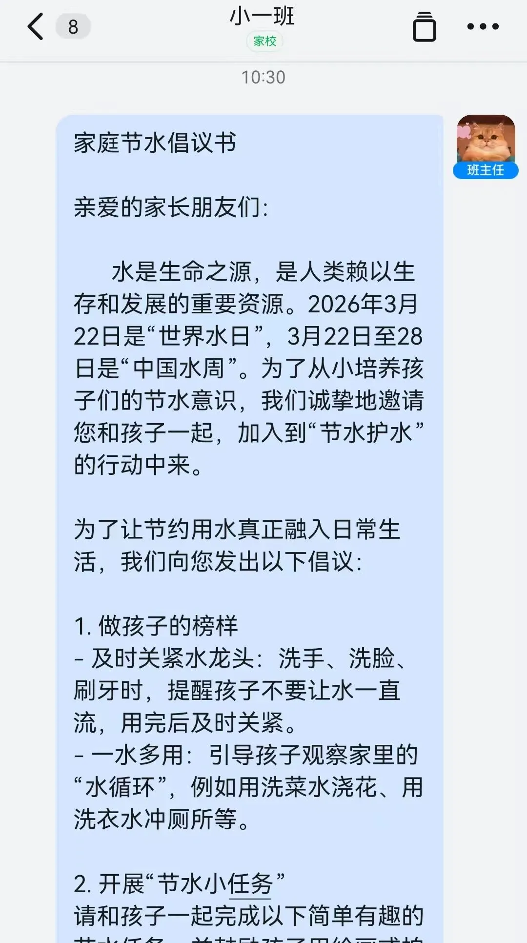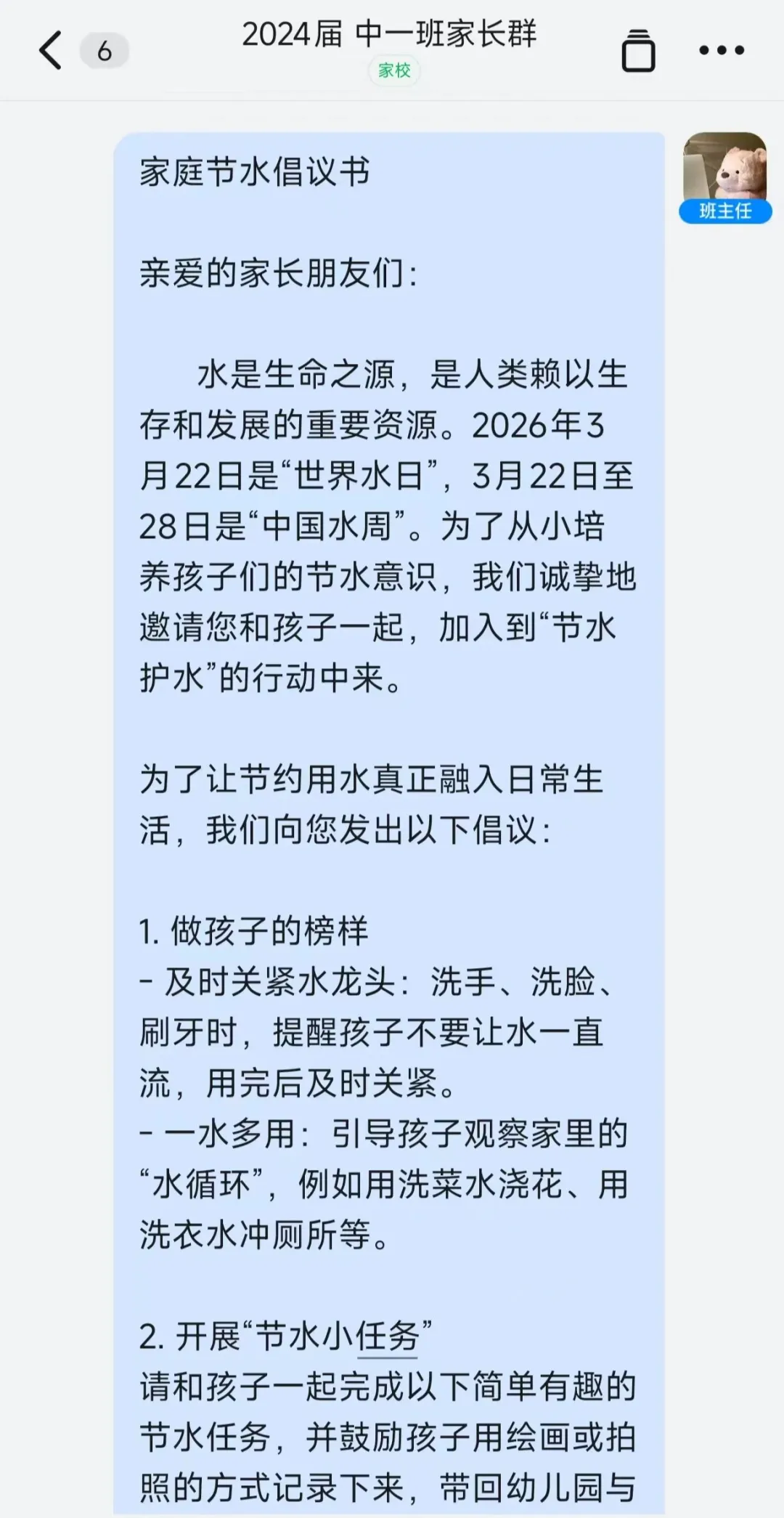 教育一个孩子,带动一个家庭,影响整个社会。为将节水理念延伸至家庭,各班班主任向班级群发送了《家庭节水倡议书》,呼吁家长和孩子一起行动,从身边小事做起,养成节约用水的好习惯。