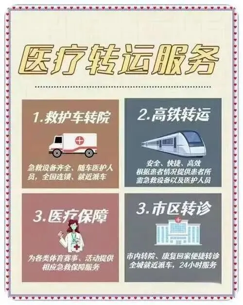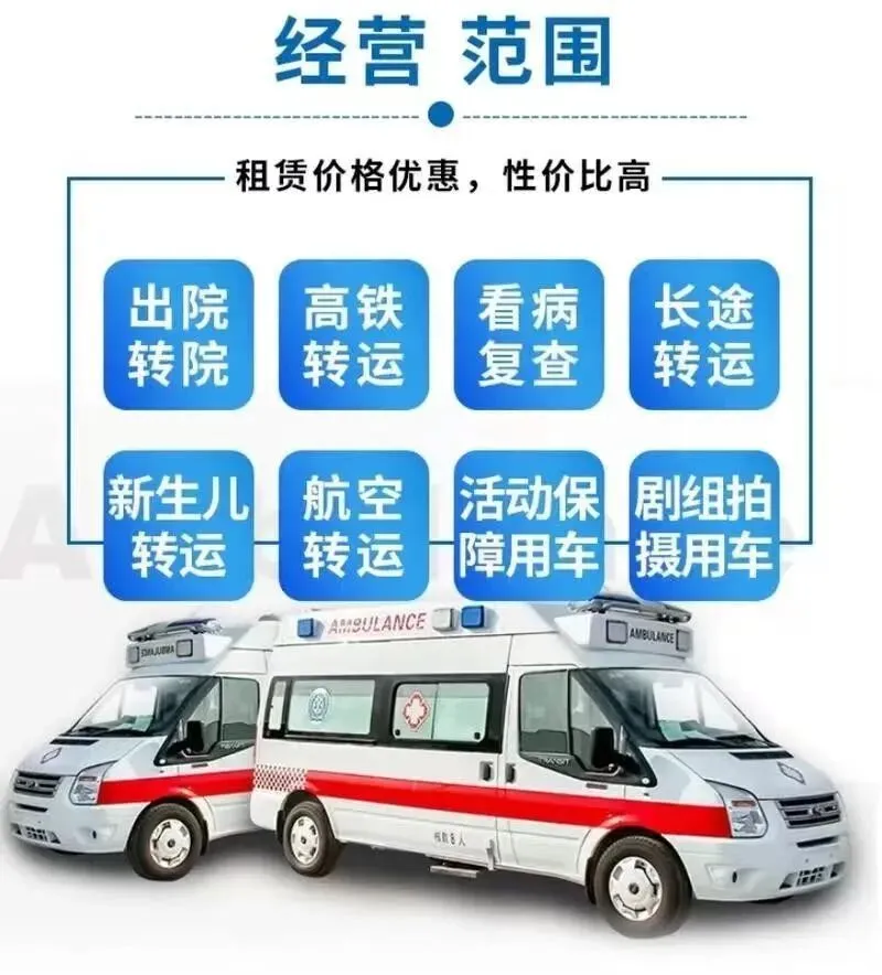 我们是救护车出租转运公司,120救护车接送病人预约护送。24小时为术后康复、危重患者及跨区域就医人群提供专业医疗转运服务,提供120救护车转运出租‖私人120救护车(非急救)‖跨省长途转运‖危重病人转运‖市内转运‖术后康复病人转运‖高铁病人转运‖患者返乡‖大型活动赛事保障‖配备ICU设备:呼吸机▪心电监护仪▪吸痰器•微量泵•氧气▪急救药箱▪专业医护团队