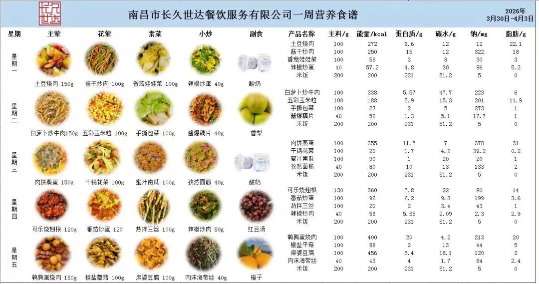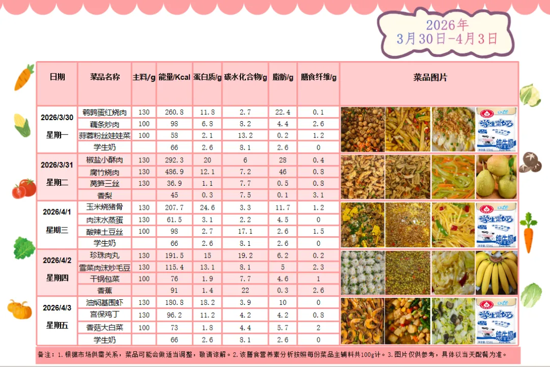 根据《南昌市中小学校(幼儿园)配送餐管理办法》和《南昌市加强校园餐管理措施十条(试行)》文件精神,现将学校2026年3月30日~4月3日周带量菜谱公示如下。