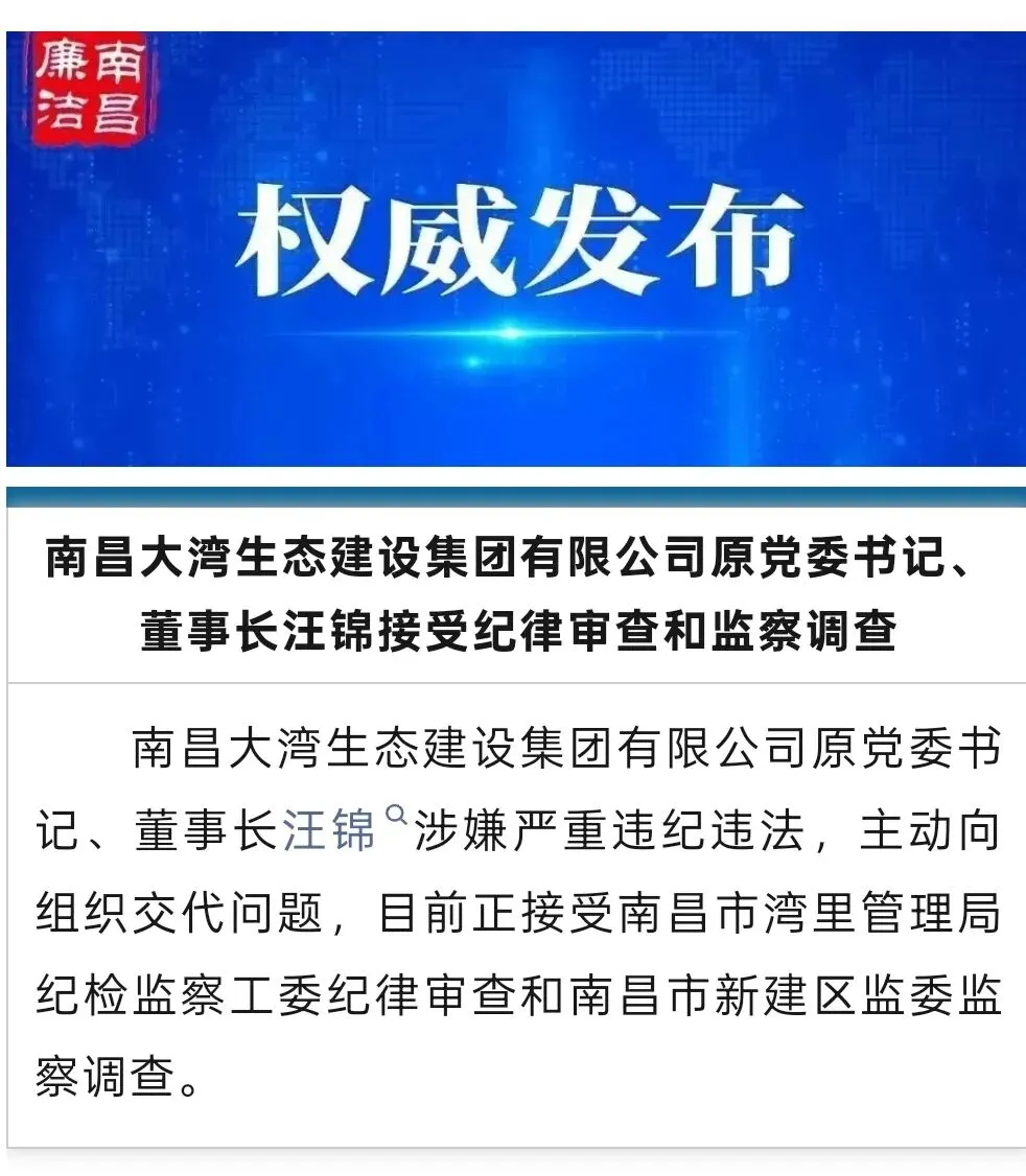 南昌大湾生态建设集团有限公司原党委书记、董事长汪锦涉嫌严重违纪违法,主动向组织交代问题,目前正接受南昌市湾里管理局纪检监察工委纪律审查和南昌市新建区监委监察调查。