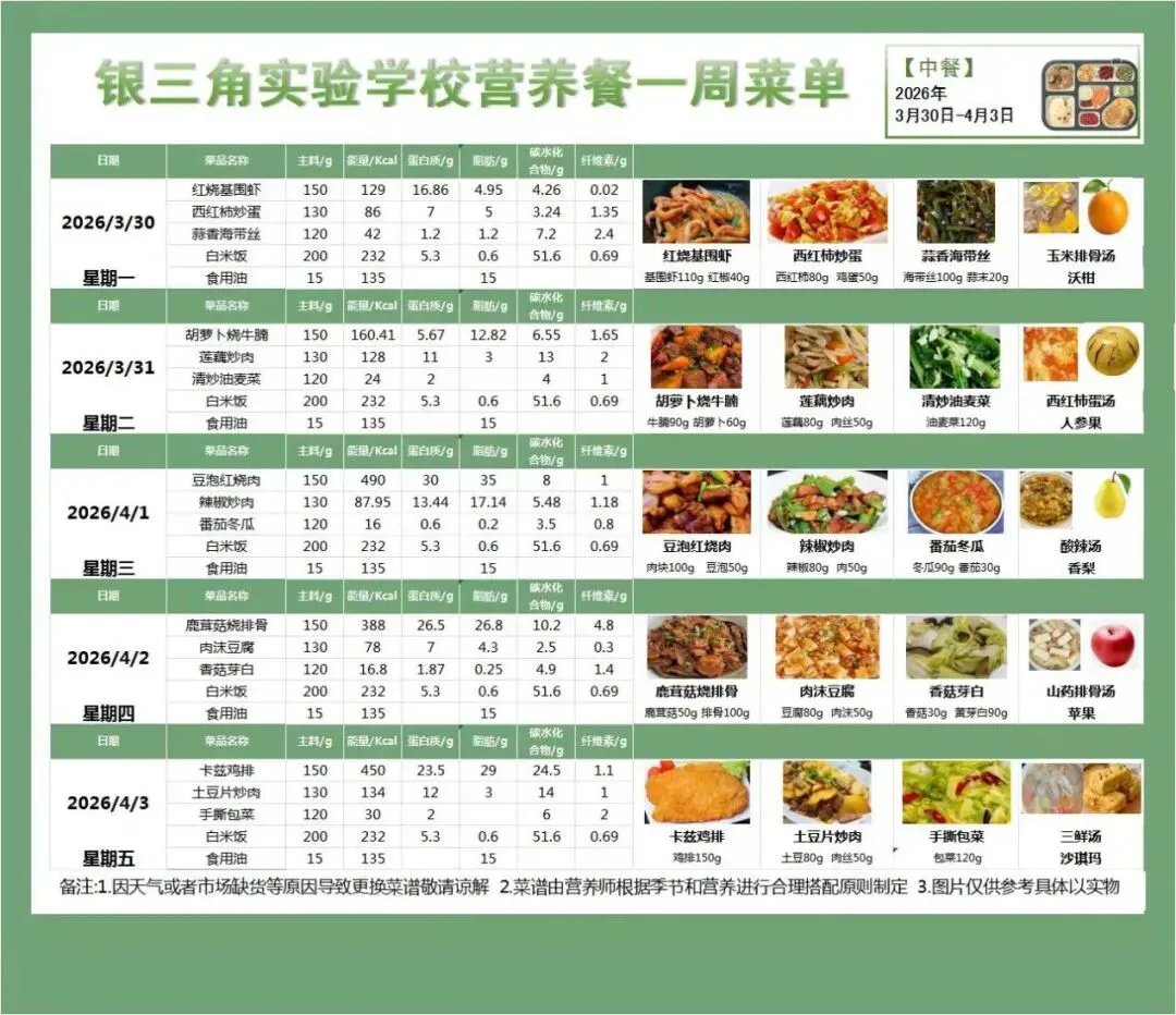 大家好!为了守护每一位师生的舌尖安全,我们每周公示校园餐菜单,确保饮食透明,健康相伴。今天,我们为大家带来本周(3月30日至4月3日)的校园餐精彩预告。
