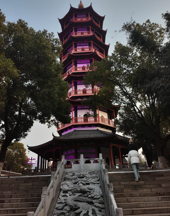 总的来说,省博物馆是大小朋友们增长见识,陶冶情操的好地方,非常值得一看。但因为晚上要去看烟花秀,我们没有太多时间,只能捡重点看,下午5点我们出馆,搭摆渡车到地铁1号线的珠江路站坐地铁去秋水广场。从秋水广场地铁口出来,看到周边已经有很多保安在维持秩序,离烟花秀还有2个多小时,秋水广场周边已经是人潮汹涌了,吃饭的馆子里人都排到外面了,而且一份炒粉涨到15元,我们抓紧时间吃点东西,给手机充充电,也去到秋水广场占位置。秋水广场里面几乎是人满为患了,临江边的好位置被挤得是里三层外三层,我们只有不停往外侧边上走,还好找到一个相对高一点,人少一点的地方,虽不靠近江边,但视野相对更开阔一点,可以看到整个江面上停了9艘船,烟花就是从船上放出来。到7点59分时,对岸的一座大厦外墙上开始十秒倒计报时,8点整烟花正式开场了,整场烟花秀分:1序篇、2春醒・万象更新(缤纷色调)、3驰骋・壮志凌云(紫红主色)、4俊逸・锦绣华年(金黄主色)、5腾跃・光耀未来(冰蓝主色)5部分,总时长28分50秒,身临其境观看还是蛮震撼的,耳边那是哇塞声一片。结束后散场都花了半个多小时,但散场后有免费的地铁坐,这点给南昌的市政服务点赞,到酒店已是快十一点了,第一天行程圆满结束。2月18号,大年初二,今天的行程是上午去江西省美术馆参观,下午去八大山人纪念馆,时间有余就顺道去绳金塔。早上收拾妥当,我们打车去省美术馆。美术馆位于八一广场对面,始建于1968年10月,原名“毛泽东思想胜利万岁馆”,多次更名,后改为美术馆,2020年正式挂牌开馆,是南昌市最具特色的标志性建筑,也是省市级文物保护单位。建筑坐西朝东,平面呈山字形,米黄外墙,顶部有立体红五星与红旗装饰,门廊处有汉白玉浮雕,兼具中式民族风与苏式建筑特点,整座建筑充满了时代的印记,非常值得一逛。我们去的时候正值“釉色里的敦煌”展,以瓷为媒,让大漠石窟与江南窑火相遇,丝路驼铃与窑火余韵共鸣,千年文明在此交融。美术馆有四层,逛完已近中午,我们出来到对面的八一广场转了一下,经过改造后的八一广场还是很不错的。八一广场最主要建筑是八一南昌起义纪念塔。纪念塔1977 年 7 月 1 日奠基(纪念南昌起义 50 周年),1979 年 1 月 8 日落成。塔身正面是叶剑英元帅题写的铜胎鎏金 “八一南昌起义纪念塔” 9 字;塔顶为 14 米高的花岗石 “汉阳造” 步枪与 8.5 米高枣红色花岗石八一军旗,象征人民军队诞生于此。军旗用四川石棉枣红岗石,步枪用山东泰山白岗石,塔身主体为福建泉州白花岗石,选料非常考究,整座塔显得庄严肃穆,来参观和打卡的人络绎不绝。逛完八一广场,我们到广场北面的万达广场吃中饭,4楼是小吃一条街,我们点了几个南昌特色菜,共花了119元。下午的行程是去八大山人纪念馆,查地图发现八大山人纪念馆离最近的八大山人地铁口有近20分钟的步行路程,所以我们打了个车过去。八大山人纪念馆坐落在南昌市青云谱区的梅湖景区,靠近南昌县,在古代属偏野郊外了,是八大山人的隐居之处。八大山人(朱耷)于清顺治十八年(1661 年)隐居于青云谱道院(今八大山人纪念馆馆址),后人在青云谱道院的基础上建立了中国第一个古代画家纪念馆。为什么叫八大山人呢?因为他的原名叫朱耷,去掉牛耳,就成了八大,而牛耳在古代一般是代指权力地位,隐喻他是一个逃难的皇室。朱耷是明太祖朱元璋第十七子朱权的九世孙,因明灭清替,国破家亡而遁入空门,以作画为生。八大山人画作最著名的特征是“翻白眼”,其画笔简意赅,形神兼备,往往以象征手法抒写心意,如画鱼、鸭、鸟等,皆以白眼向天,造型夸张奇特,意境苍凉悲愤,寄寓着其对故明之思与亡国之痛,以及对满清统治之愤懑。整个梅湖景区挺大的,参观完纪念馆,建议到清廉园逛逛 ,这里一步一景,步步皆画,小桥流水,亭台楼阁,有江南水乡,苏式园林之韵味,逛完梅湖景区,我们乘地铁3号线到绳金塔站,从3号口出来,准备去逛一下绳金塔。不用门票,不用预约,可直接入园。绳金塔是南昌的小众景点,但历史悠久,已有一千余年,塔本身是南昌现存最古老的高层古建筑,也是南昌的镇城之宝,从南门入园>祈福长廊>绳金塔主塔>剑池>大成殿>千佛寺>鸣江园>东门出园,沿途可串联所有核心人文景点,风铃随风响动的声音特别治愈。剑池里好多许愿的硬币,很有烟火气,旁边大成殿供奉孔子,带孩子的可以拜拜,总之园不太大,但可逛的还不少。逛完绳金塔,已到下午6点,我们从东门出园,在门口打车去珠宝街逛小吃一条街。珠宝街位于南昌市西湖区,南到孺子路北到中山路共400来米的一条老街,是和蛤蟆街齐名的烟火气十足的小吃街,遍布地道的南昌小吃,瓦罐汤,南昌拌粉,麻辣藕片,绿豆饼,白糖糕,还有在当地很受欢迎的洪都大姆指奶茶等等,尤其是夜市,更是热闹。一条街从头逛到尾,东吃吃西吃吃也就吃饱了,出来到中山路向左走就是八一起义纪念馆,晚上也可以入馆参观,可惜我们没有预约到,只能在外面瞅了一下。如果能预约好行程的朋友们,可以先参观滕王阁,再参观八一起义纪念馆,再逛万寿宫,晚上再逛珠宝街,这几个景点都在附近一块的,行程也是完美的哈。再向前走就到了万寿宫了,整个景区也是有吃有逛有玩的,我们先到”老南昌打平伙“吃了相当嘴馋的蟹脚捞粉,就点一份,算是品尝下味道。味道是很鲜香,但就是辣,建议大