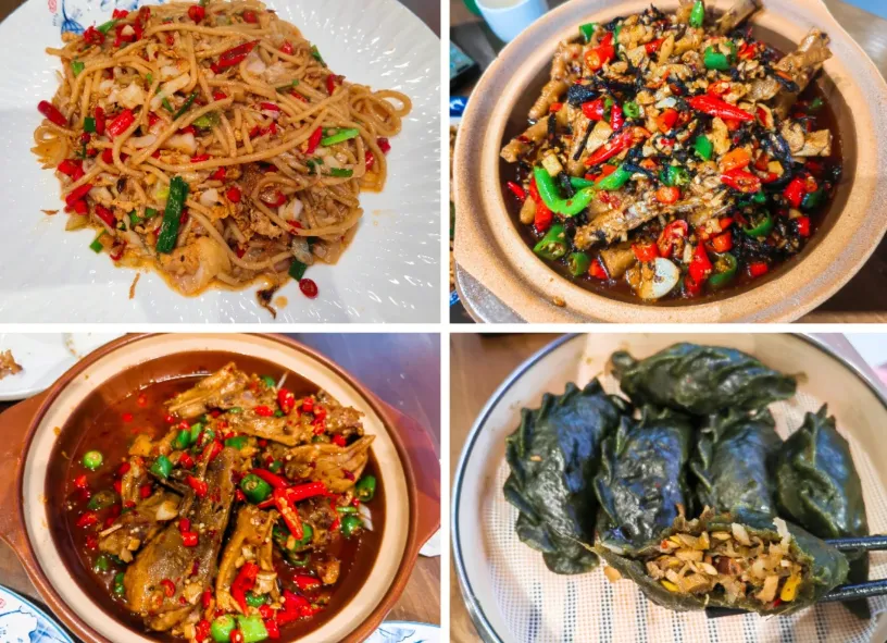 余江的吃,不是花样多,而是胃很容易被安顿好。早上可以从一碗江西米粉开始,汤底清,米香软,吸溜几口,人就醒了。配个灯芯糕或者清明粿,甜一点,糯一点,嘴里有股草木气。中午适合吃茄子干烧肉、米粉蒸肉、藜蒿炒腊肉。尤其茄子干烧肉,干香里带点回甜,肥肉被炖得发亮,但不腻,拌饭很稳。晚上别吃太满,点一条信江河鱼,再来碗汤,风一吹,心就缓了。