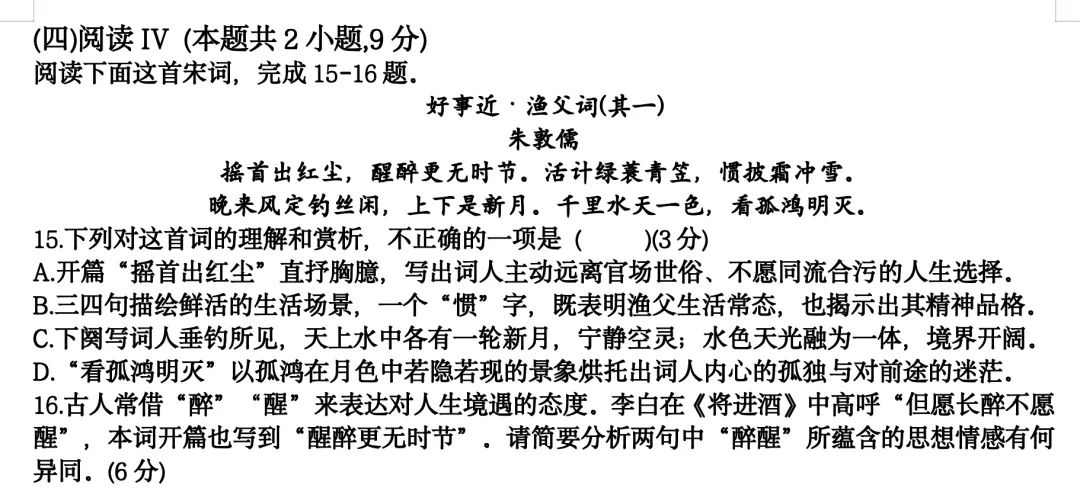 16.古人常借“醉”“醒”来表达对人生境遇的态度。李白在《将进酒》中高呼“但愿长醉不愿醒”,本词开篇也写到“醒醉更无时节”。请简要分析两句中“醉醒”所蕴含的思想情感有何异同。(6分)