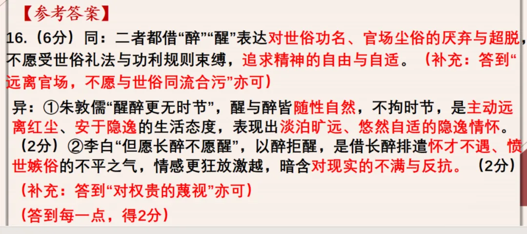 第二步:梳理“相同点”——聚焦“醉醒”的共同情感内核:古人借“醉”“醒”多表达对现实的不满、对自由的追求,摆脱世俗束缚的愿望。结合文本可知,李白“但愿长醉不愿醒”与朱敦儒“醒醉更无时节”,均蕴含着对世俗官场(或现实处境)的厌恶,对不受束缚、自由随性生活的向往,这是二者的共性。
