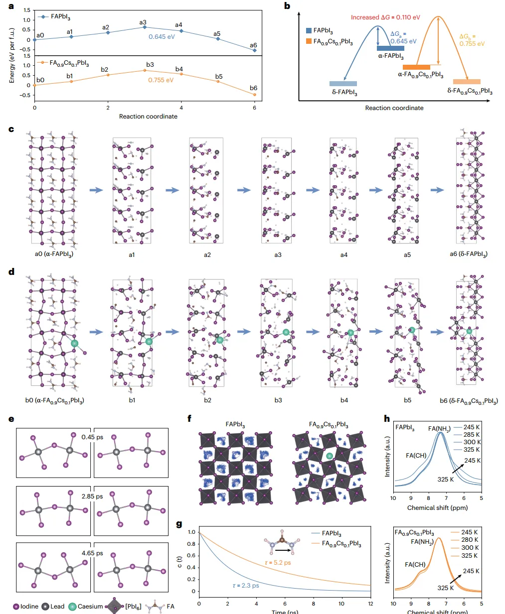 基于此,南昌大学陈义旺等人设计了4-(二苯基膦基)苯甲酸铯,以实现有效的Cs+掺杂并使阳离子分布均匀化,从而获得具有改进相稳定性的高质量钙钛矿薄膜。因此,通过两步法制造的太阳能电池实现了26.91%的效率(认证为26.61%)。包含热稳定电荷传输层的器件在最大功率点跟踪和85°C下在1个太阳光照下连续运行1500小时后,保持了95%的初始效率(23.76%) (ISOS-L-2协议) 。本研究深入探讨了FA0.9Cs0.1PbI3的相变途径和相应的过渡态结构,以及Cs+驱动钙钛矿晶格稳定的机制。该论文近期以“Controlled Cs⁺ incorporation through organocaesium salts in α-FA–Cs perovskite solar cells with a certified efficiency of 26.61%”为题发表在顶级期刊Nature Energy上。