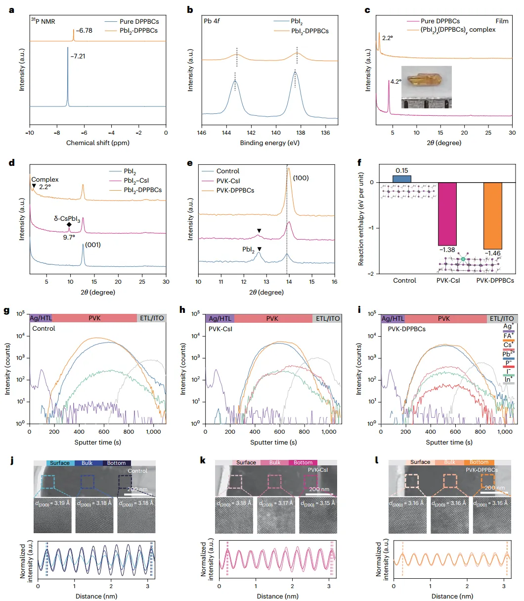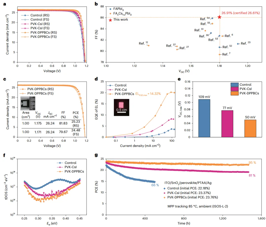 总之,作者阐明了FA0.9Cs0.1PbI3钙钛矿的相变途径和相应的结构变化。我们得出结论,Cs+通过锁定[PbI6]4−八面体和抑制FA+旋转来增强晶格稳定性和相变势垒。同时,通过在FA0.9Cs0.1PbI3的两步制备过程中引入DPPBC,成功抑制了δ-CsPbI3的产生,并有效地掺杂了Cs+。DPPBCs的引入降低了钙钛矿形成的反应焓,并促进了Cs+和FA+在钙钛矿薄膜中的均匀分布,从而提高了相稳定性。因此,经DPPBCs处理的太阳能电池实现了26.91%的PCE冠军,VOC为1.18 V和FF为86.11%。此外,在1倍太阳辐照、最大功率点跟踪和85°C(ISOS-L-2协议)的条件下连续运行1500小时后,带有热稳定电荷传输层的封装器件仍能保持其初始效率(23.76%)的95%。这些发现为FA–Cs钙钛矿的相分离/相变提供了见解,并为优化长期稳定的FA–Cs PVSC提供了科学指导。