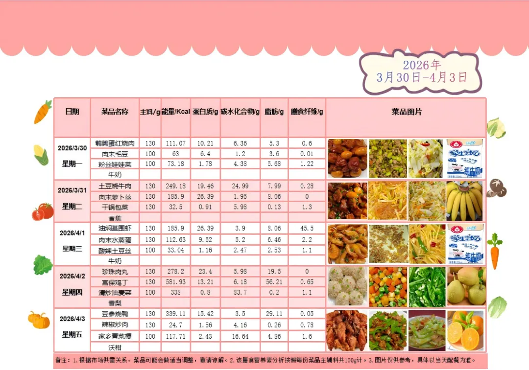 根据《南昌市中小学校(幼儿园)配送餐管理办法》和《南昌市加强校园餐管理措施十条(试行)》文件精神,现将学校2026年3月30日—2026年4月3日带量菜谱公示如下。