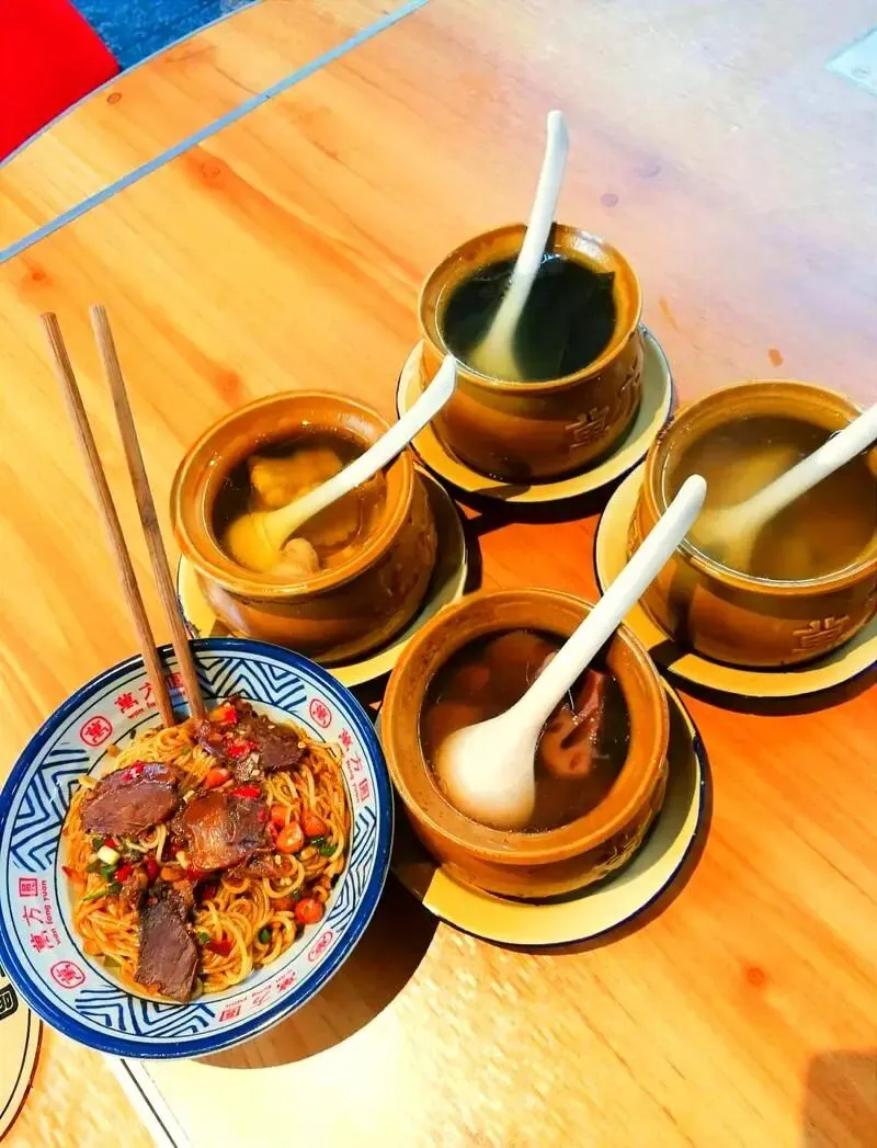 镇上早点简单顶饿,瓦罐汤,拌粉,烧饼夹肉,五分钟就上桌。
