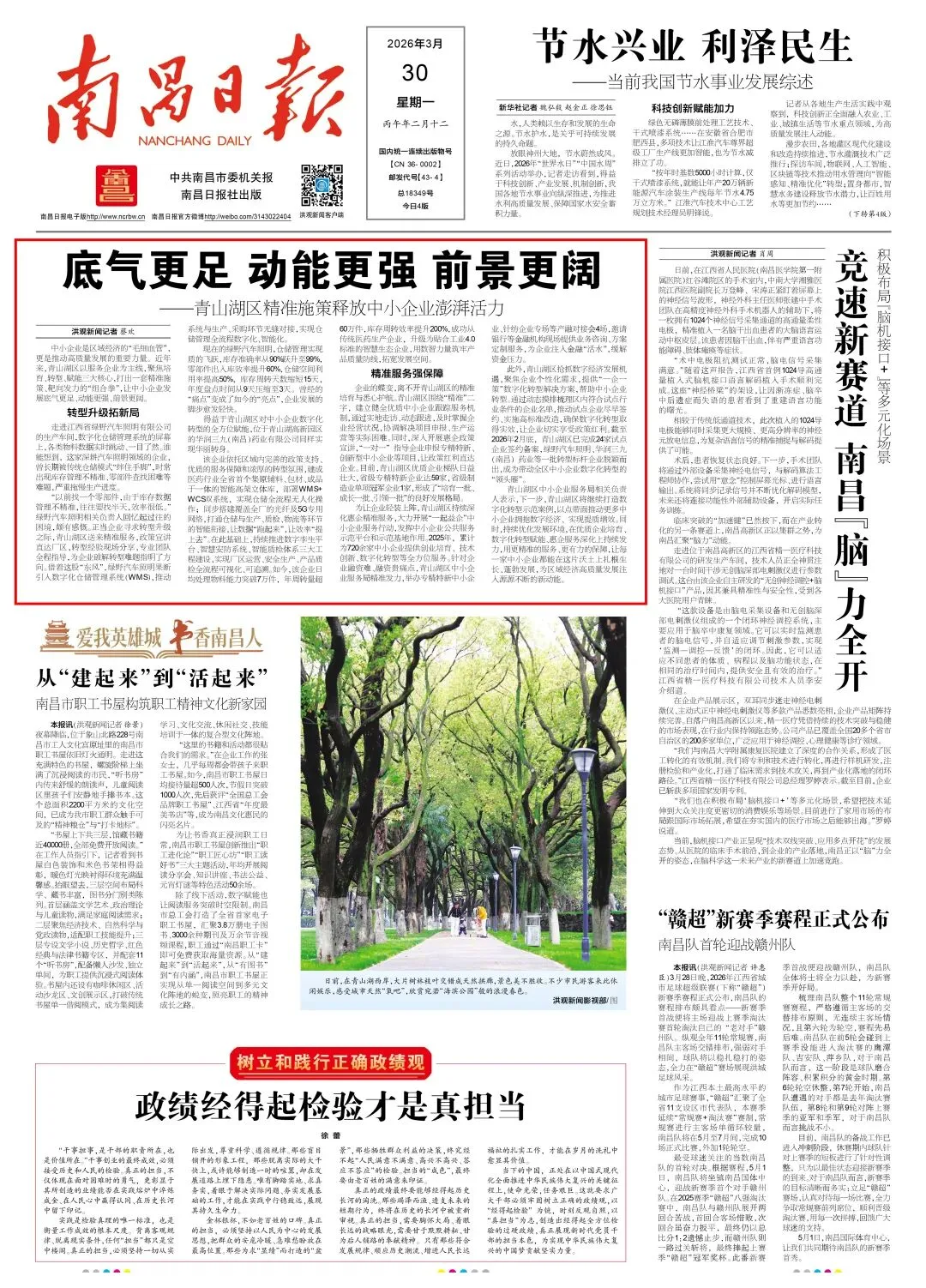 3月30日,南昌日报头版头条刊发我区稿件《底气更足 动能更强 前景更阔——青山湖区精准施策释放中小企业澎湃活力》,报道中写道:青山湖区以服务企业为主线,聚焦培育、转型、赋能三大核心,打出一套精准施策、靶向发力的“组合拳”,让中小企业发展底气更足、动能更强、前景更阔。
