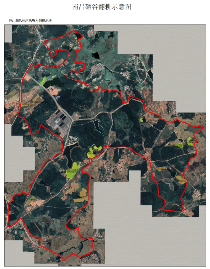 (六)翻耕等农机作业地点:南昌硒谷钟陵现代农业产业园(江西省南昌市进贤县钟陵镇九号路)。本次农机作业服务为示意图中黄色地块标识区域: