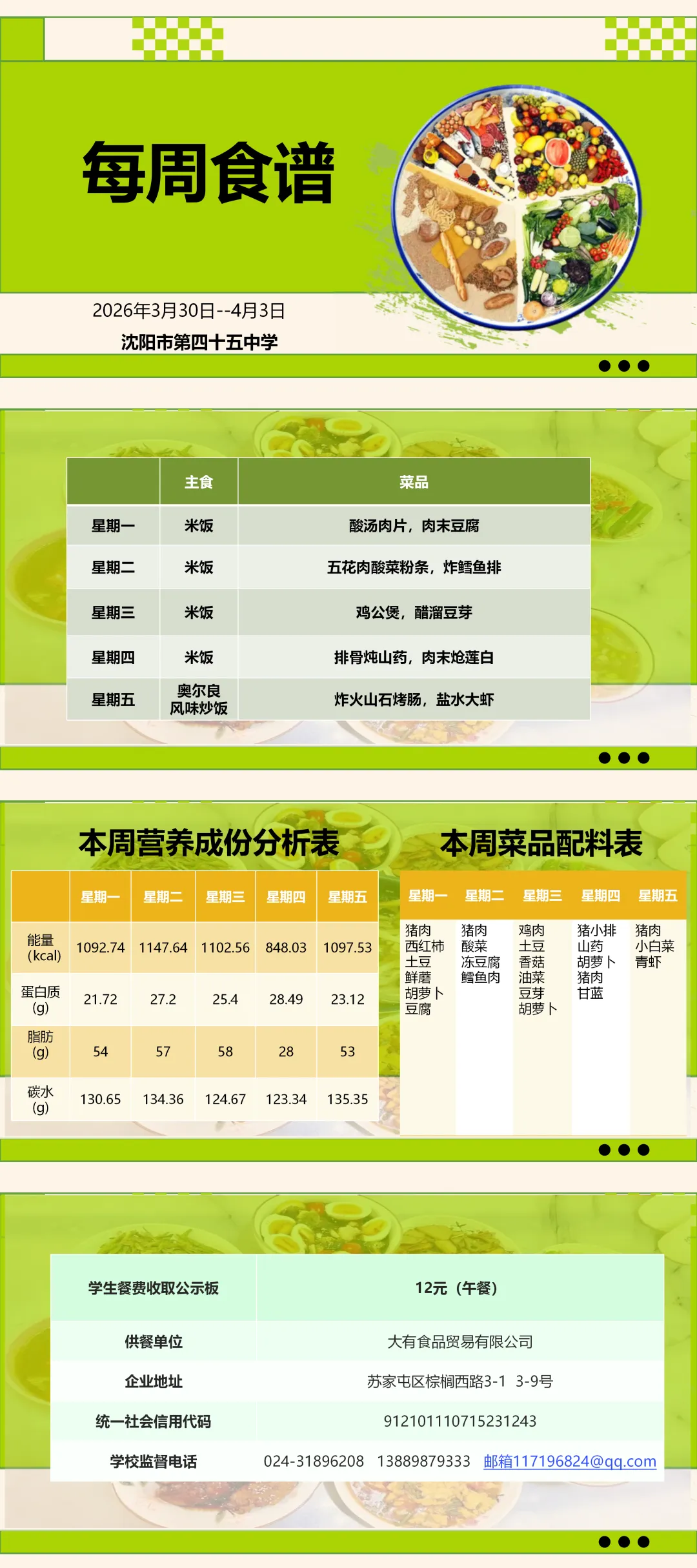 【南昌 满融】沈阳市第四十五中学2026年3月30日-4月3日食谱