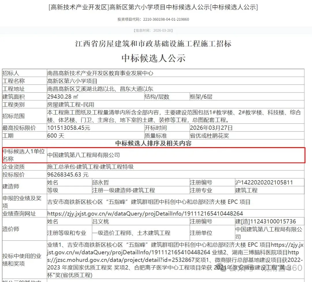 近日,南昌高新区第六小学项目施工招标结果正式出炉,中国建筑第八工程局有限公司成功中选为该项目第一中标候选人,项目即将迈入开工建设阶段。