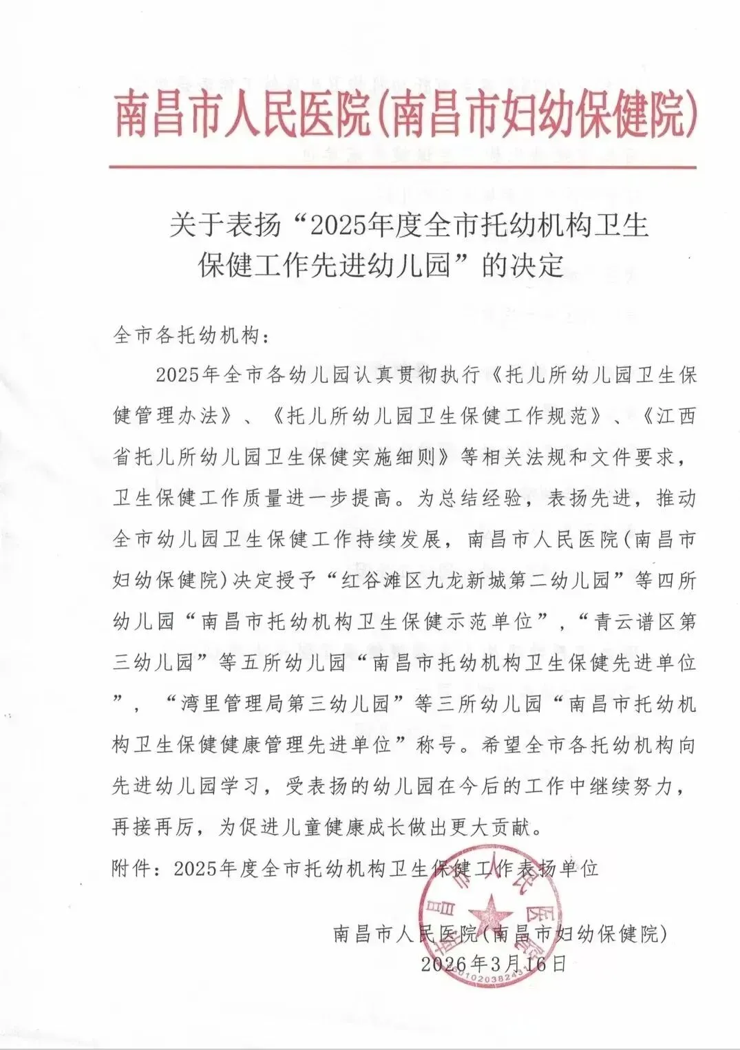 喜报传来!在南昌市妇幼保健院发布的《关于表扬“2025年度全市托幼机构卫生保健工作先进幼儿园”的决定》中,南昌市青云谱区第三幼儿园凭借扎实的卫生保健工作与规范的日常管理,成功获评南昌市托幼机构卫生保健先进单位!