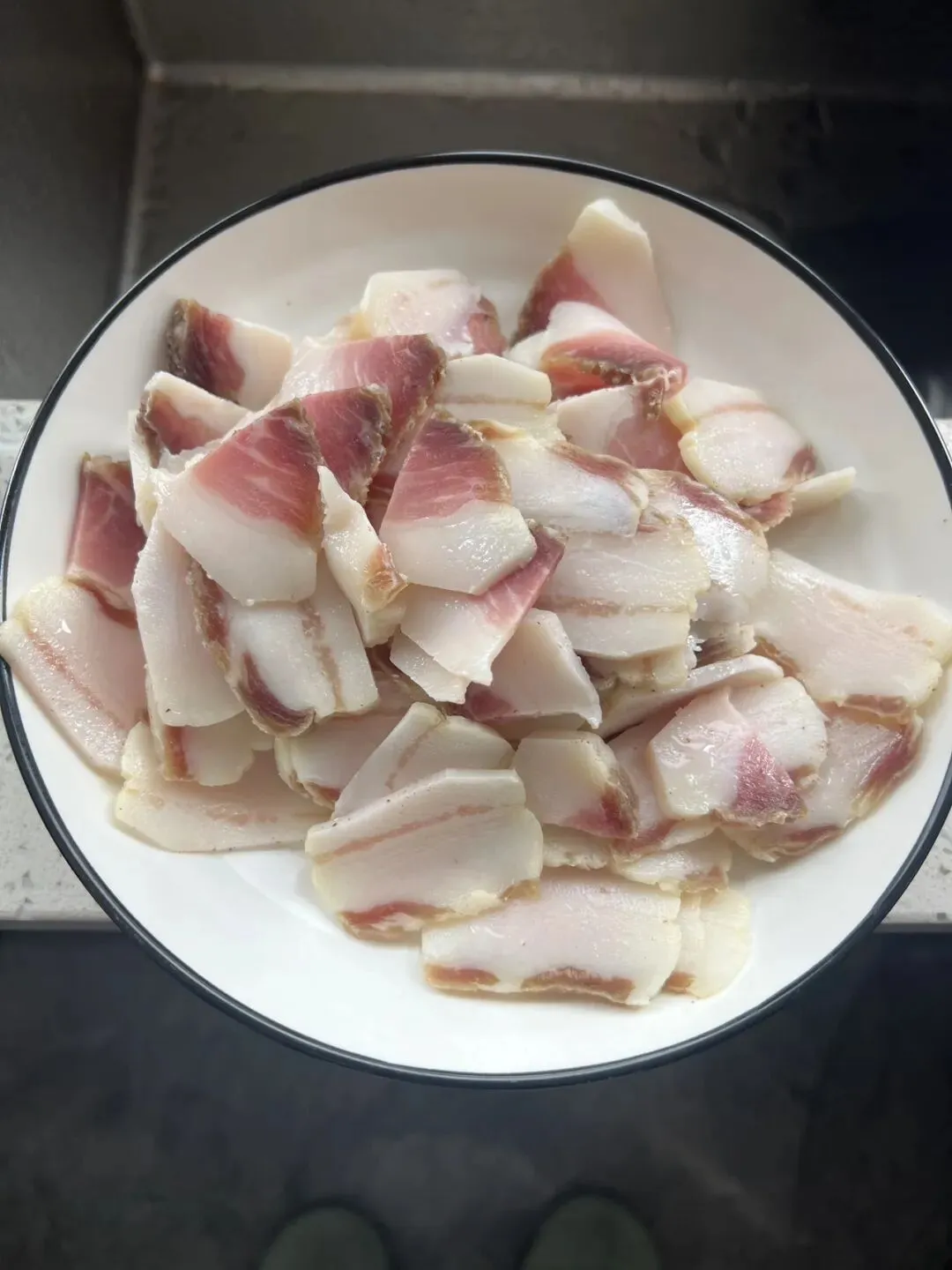 再看那盘腊肉,是年前晒好的,切腊肉也是个技术活,要切得薄如蝉翼,肥瘦相间。