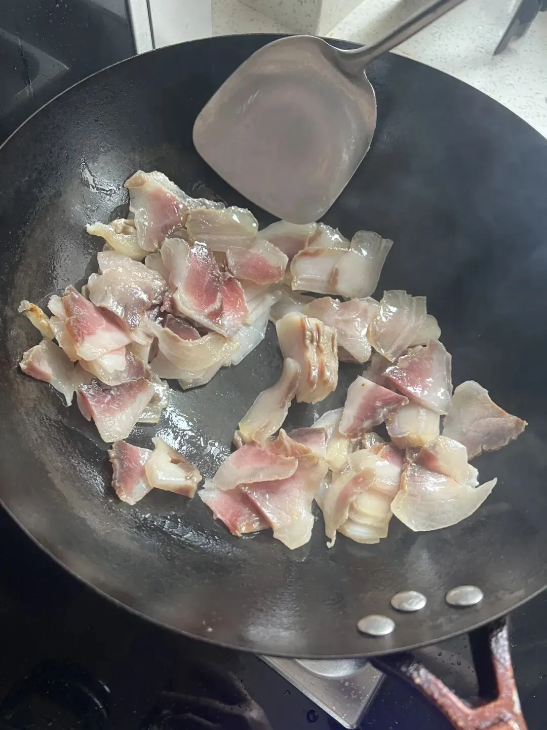 热锅下油,先把腊肉倒进去煸炒,滋滋啦啦的响声里,油脂慢慢渗出来,香气瞬间就弥漫了整个屋子。