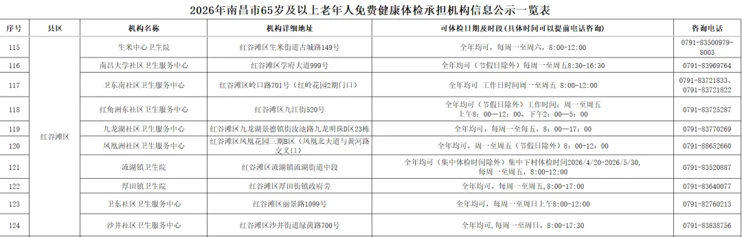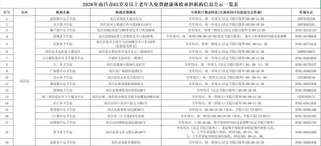 关爱老年健康,乐享幸福晚年。为全面落实国家基本公共卫生服务惠民政策,提升我市基本公共服务满意度,切实保障全市老年人身体健康,做到无病早预防、有病早发现,2026年度南昌市65岁及以上老年人免费健康体检服务已全面启动!家门口的免费健康福利,千万别错过!