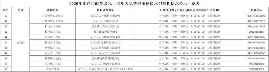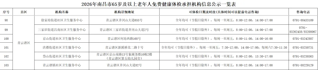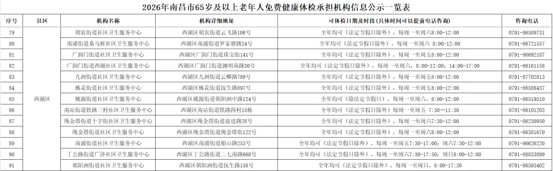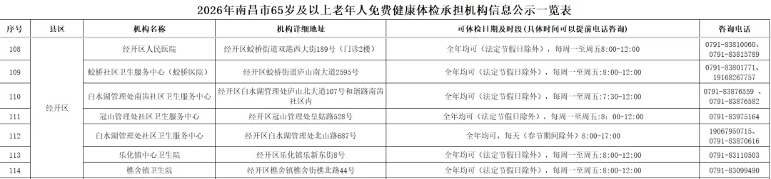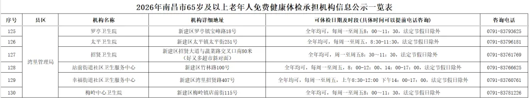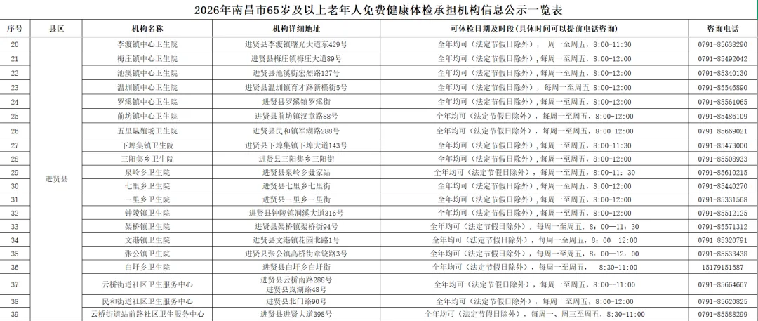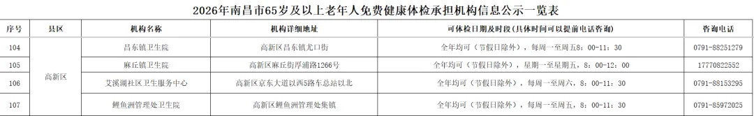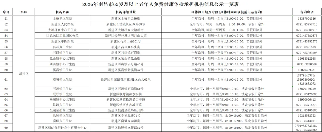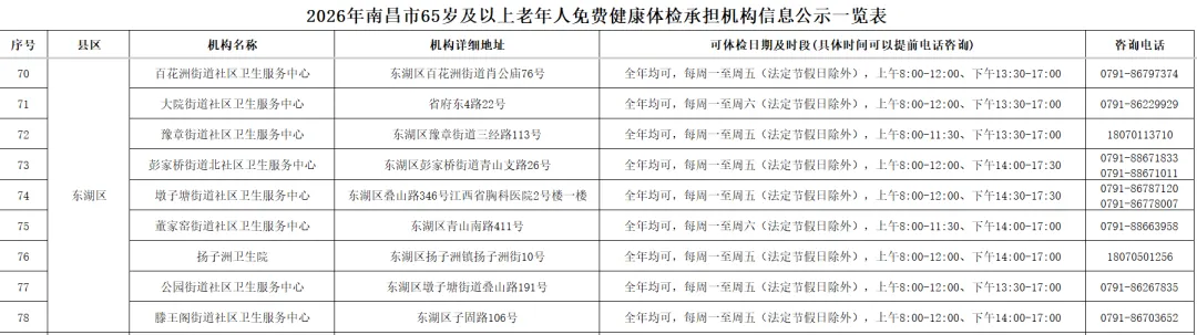 全市提供65岁及以上老年人免费健康体检的基层医疗机构信息(包括机构名称、地址、体检服务时间、咨询电话)公布如下: