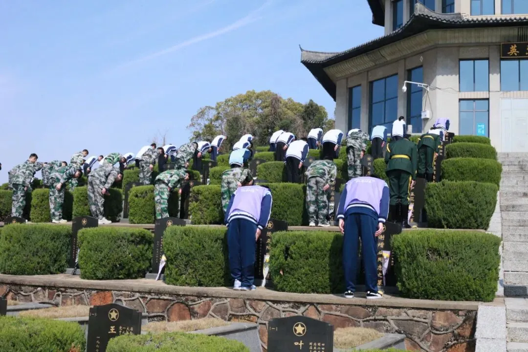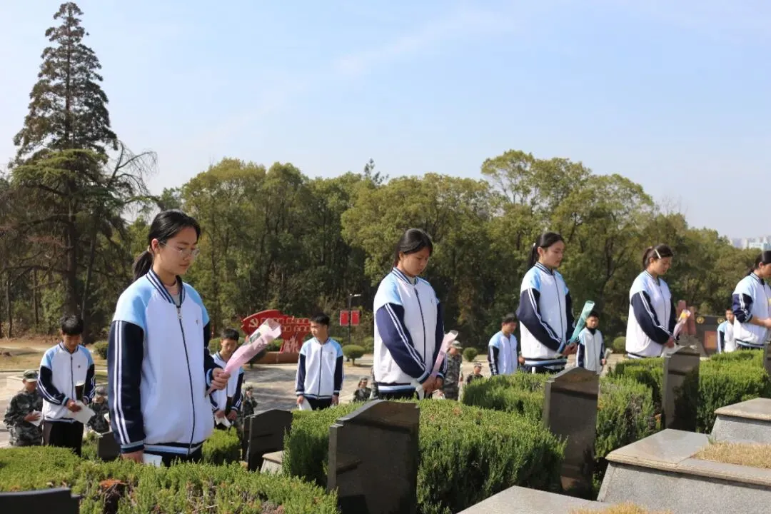 青山埋忠骨。全体师生肃立默哀,深切悼念革命先烈。学子们敬献花篮,缓步绕行纪念碑,仔细擦拭墓碑、献上鲜花,以实际行动表达缅怀与传承之志,红色基因在春风中传递。