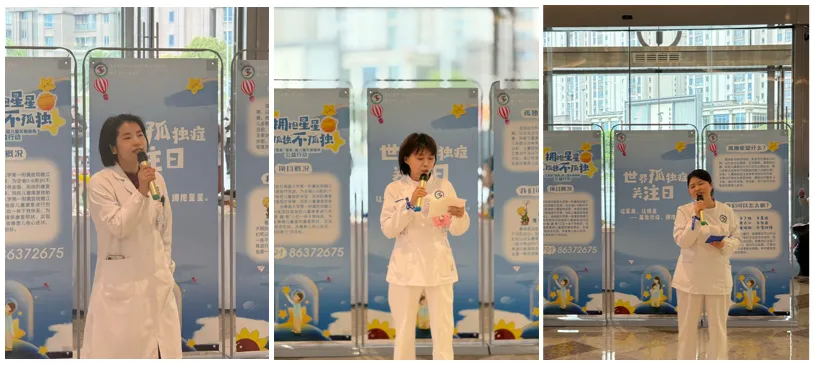 活动现场,儿科团队为群众发放象征关爱与包容的蓝丝带、蓝色气球,拉开公益活动序幕。本次活动由科室负责人张丽娜现场致辞,护士长娄春燕主持,讲解孤独症儿童的成长困境,澄清大众常见认知误区,阐明公益初心。儿童康复专科医师开展专业科普,强调孤独症属于先天性神经发育障碍,呼吁全社会放下偏见、温柔守护特殊儿童,引发全场共鸣。