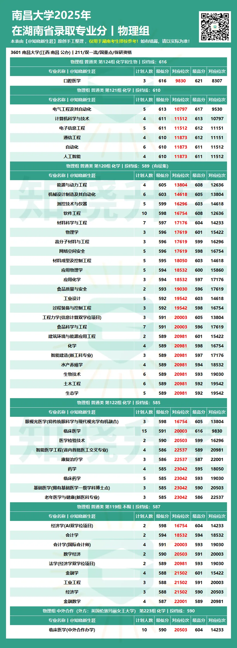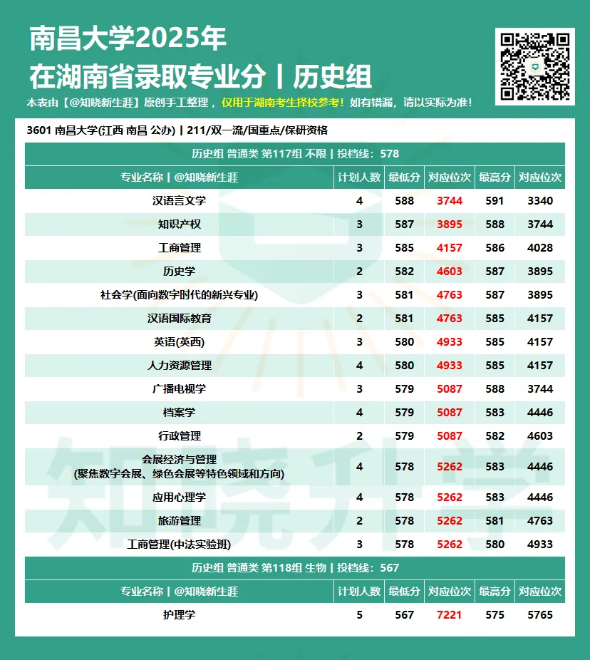 为助力湖南考生与家长科学定位,【知晓新生涯】公众号将陆续发布 《全国各大学2025年在湖南省各专业录取分数线及对应位次》。本数据并已按各专业组的专业录取最低分进行了高低排序,旨在: