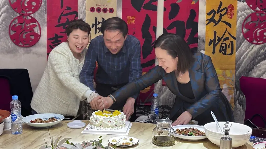 生日会现场精心布置,喜庆的横幅、寓意美好的福字贴、“平安喜乐、岁岁欢愉”的祝福条幅,将氛围感拉满。桌上摆满了丰盛的家乡风味菜肴,香甜的生日蛋糕静静摆放,每一处细节都藏着商会对会员们的用心与关怀。