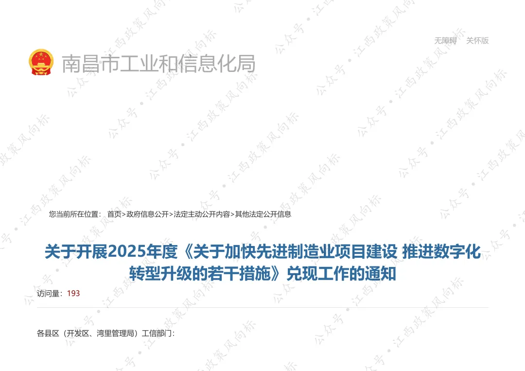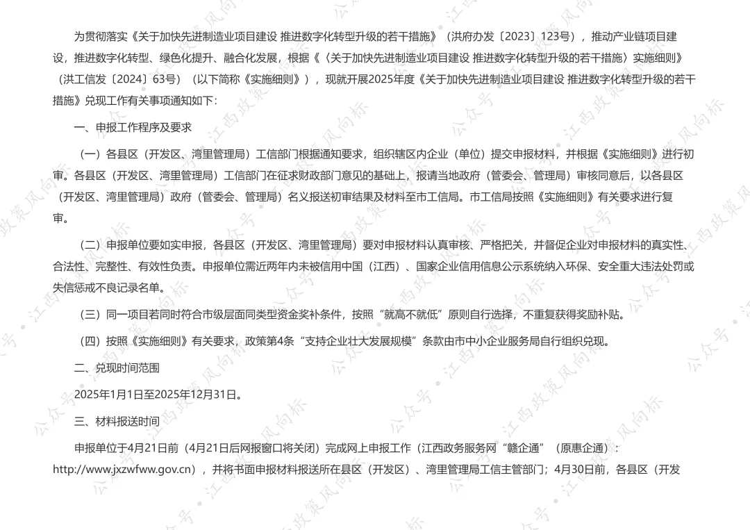 为贯彻落实《关于加快先进制造业项目建设 推进数字化转型升级的若干措施》(洪府办发〔2023〕123号),推动产业链项目建设,推进数字化转型、绿色化提升、融合化发展,根据《〈关于加快先进制造业项目建设 推进数字化转型升级的若干措施〉实施细则》(洪工信发〔2024〕63号)(以下简称《实施细则》),现就开展2025年度《关于加快先进制造业项目建设 推进数字化转型升级的若干措施》兑现工作有关事项通知如下。