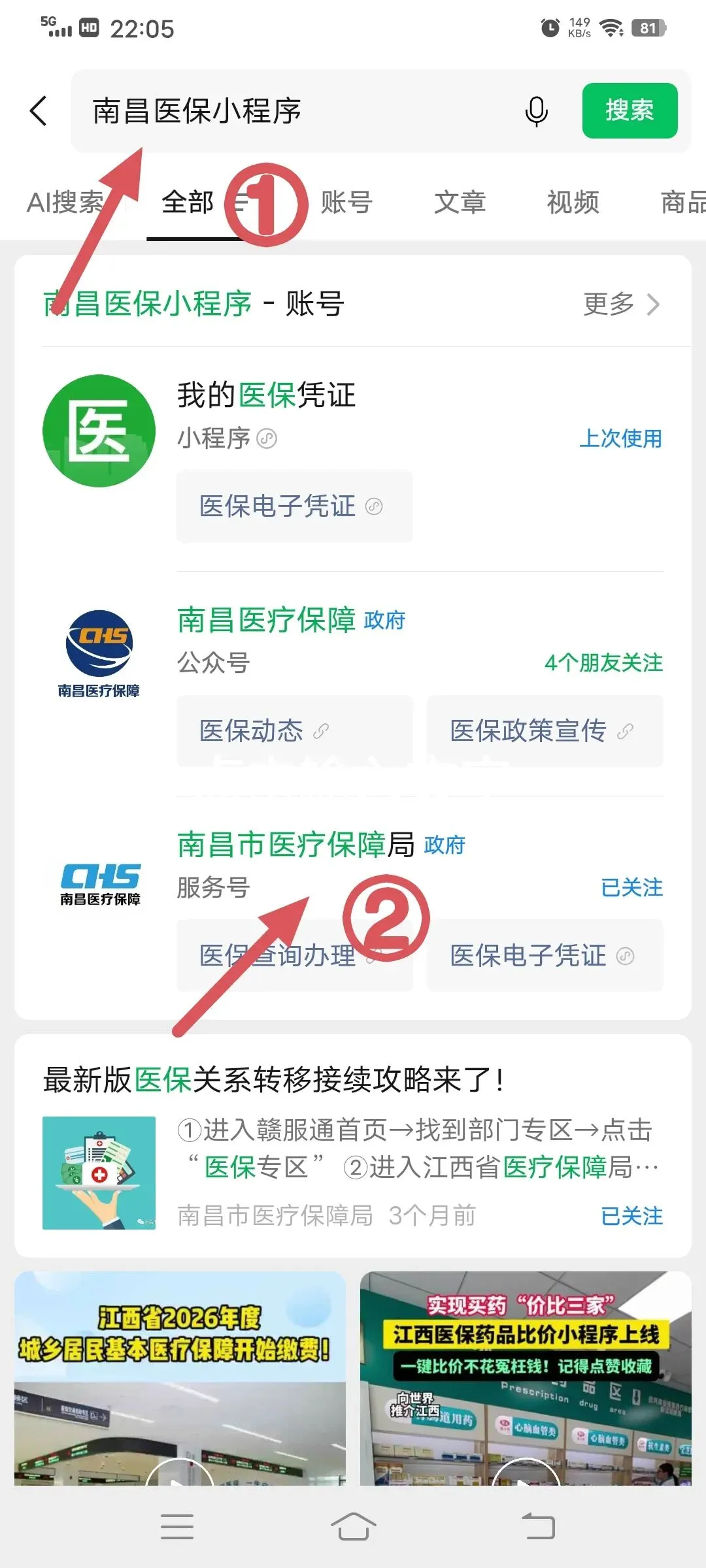 1. 微信搜【XX市医疗保障局】,认准带「政府」标识的官方服务号,比如:南昌就可以搜【南昌医保小程序】就会有