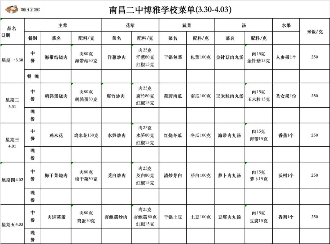 科学配餐 守护成长 | 南昌五中实验学校一周菜谱公示(3.30-4.5)