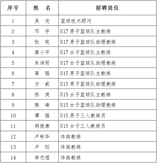 根据南昌市U系列篮球教练员招聘办法,面试环节已于3月25日顺利完成。现将拟录用人员予以公示: