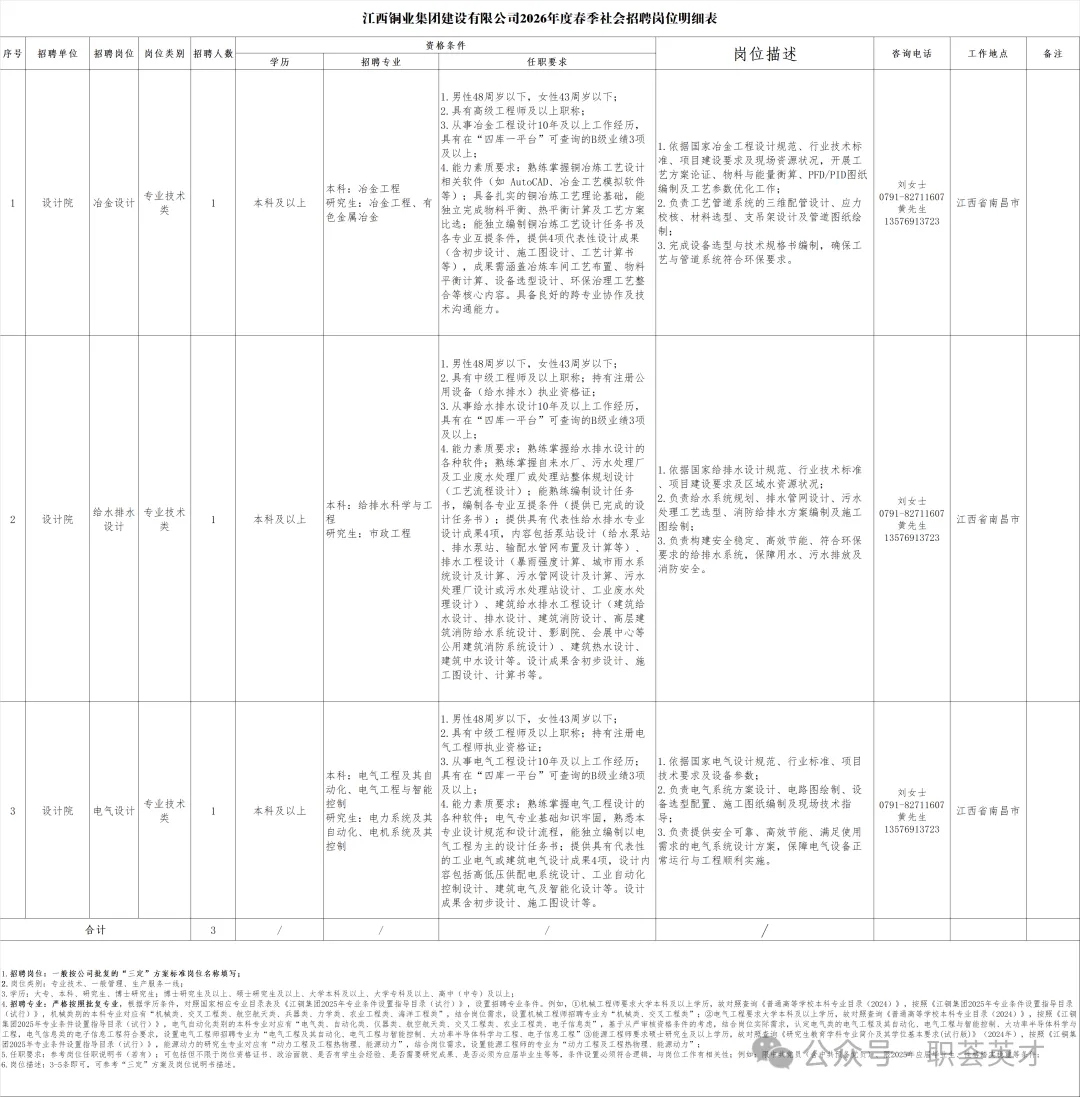 本次社会招聘3个岗位,拟招聘3人,招聘岗位名称、岗位类别、招聘人数、报考条件、具体任职要求及岗位描述等内容详见《江西铜业集团建设有限公司2026年度春季社会招聘岗位明细表》(附件1)。