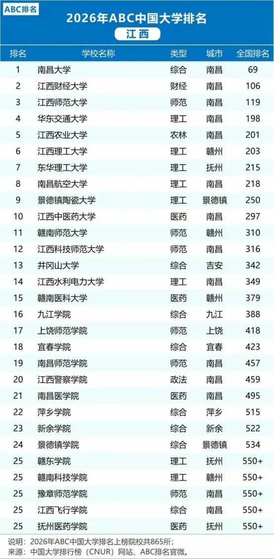 所以ABC2026中国大学排名江西地区的公布,用南昌大学69名、江西财经大学106名、东华理工大学215名等具体的排名,给我们勾勒出了一幅江西高等教育的现实图景。该份榜单是总结过去的办学成果,又是规划未来的参照。它表明江西省有全国重点到地方应用型不同的层次高校,能为各种考生提供升学通道。选择大学,是人生的重大决定。参考排名的同时更要听从自己内心的召唤,结合自身的兴趣爱好和特长爱好来做出没有后悔的决定。填报江西高校的时候,综合排名更重还是所处城市和专业特色更重?衷心希望读者给与提出宝贵的意见。