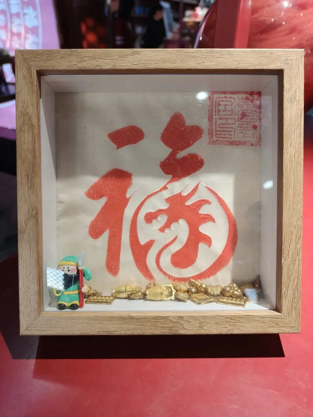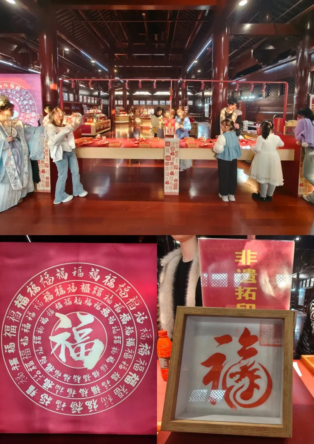 万寿宫大殿分为上下两层,基本以文创售卖和非遗体验为主,尤其是二楼的非遗“拓片”体验吸引了不少游客。我观察了一下,“拓片”内容是“寿”、“福”两字,符合大众的心理需求。体验过程也是非常简单,一张白纸、一套模板、一个印泥,整个过程只需几分钟,那个大红的“福”或“寿”字便展现在眼前,符合“极少时间”原则。不到四十元给装裱一下,一个木质画框加上“五谷丰登”的口彩,便将手作非遗带回了家,符合“极少费用”原则。