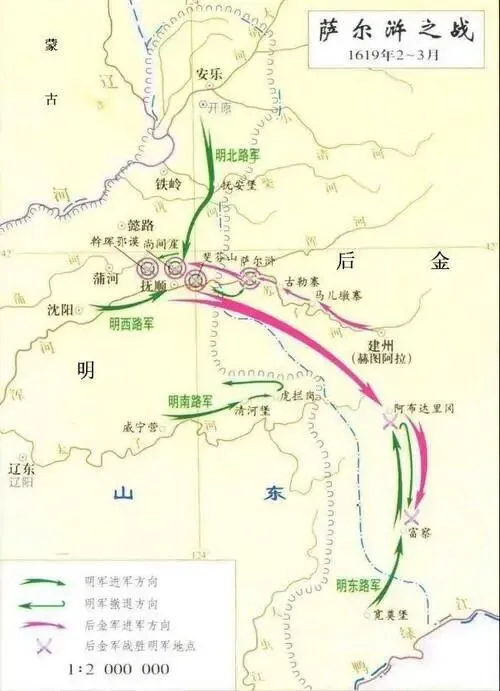 明朝朝野震惊,急调全国精兵,进军后金。花甲之年的刘綎,再次被朝廷起用,任命为左府佥书,奔赴辽东。万历四十七年(1619),朝廷以杨镐为经略,分兵四路,大举伐金,这便是历史上著名的萨尔浒之战。刘綎率领的东路军,是四路之中战斗力极强的一支,麾下有川军、浙军,还有朝鲜援军。经略杨镐指挥失当,四路大军各自为战,给了努尔哈赤各个击破的机会。努尔哈赤集中优势兵力,先破西路杜松,再击北路马林,随后调转主力,全力围攻刘綎东路军。