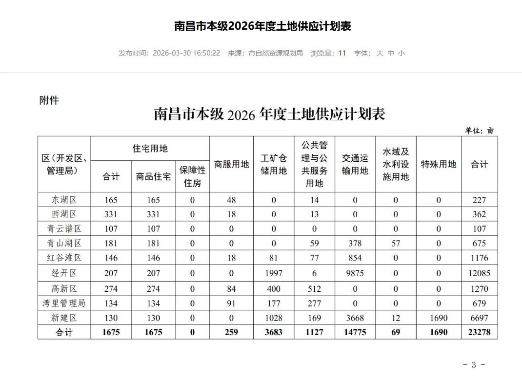 今天,南昌市自然资源局官网公示了2026 年土地供应计划。