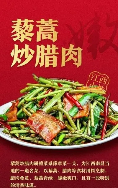 国家级的烹饪典籍《中国名菜谱》《中国名菜大典》,都收录了“藜蒿炒腊肉”。2008年,“藜蒿炒腊肉”入选北京奥运会菜单。2021年2月1日,江西省商务厅官方发布,“藜蒿炒腊肉”被评为赣菜“十大名菜”之一。