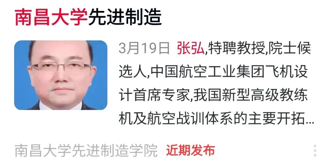 3月19日,南昌大学先进制造学院官网更新了一则教师信息。张弘,特聘教授,院士候选人,中国航空工业集团飞机设计首席专家,L15/教10系列飞机总设计师,正式以博士生导师身份出现在师资队伍中。
