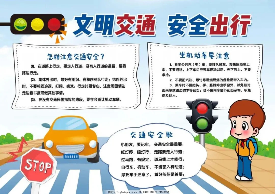 假期出行请遵守交通规则,不乘坐无牌无证、超载超员的车辆;步行出行注意来往车辆,不横穿马路、不追逐打闹;家长自驾出行请谨慎驾驶,避免疲劳驾驶、超速行驶,确保出行安全。