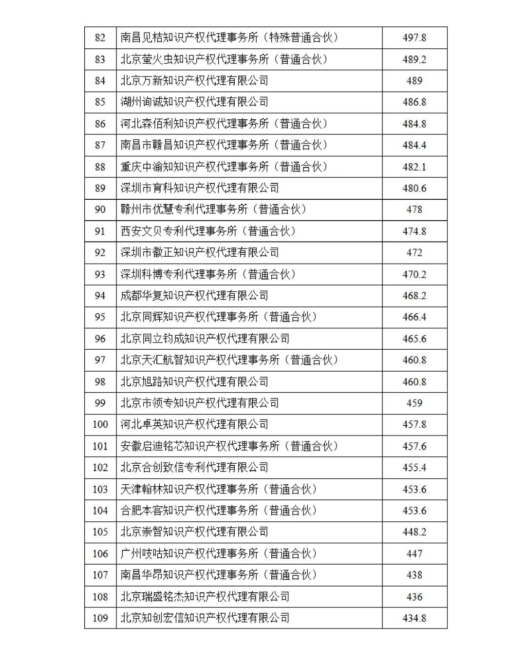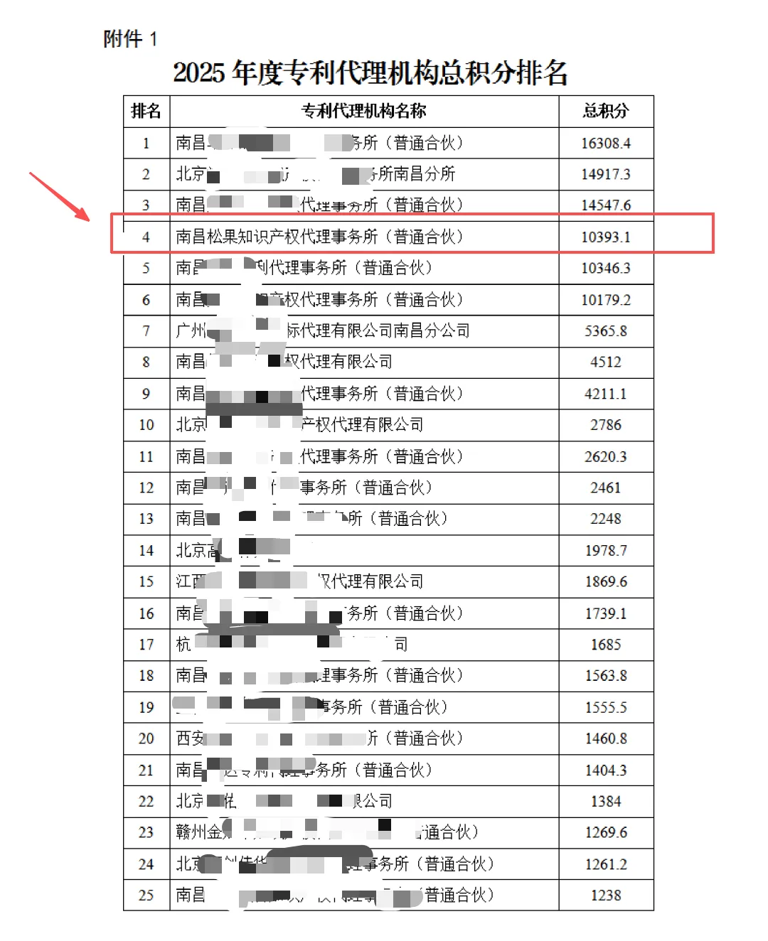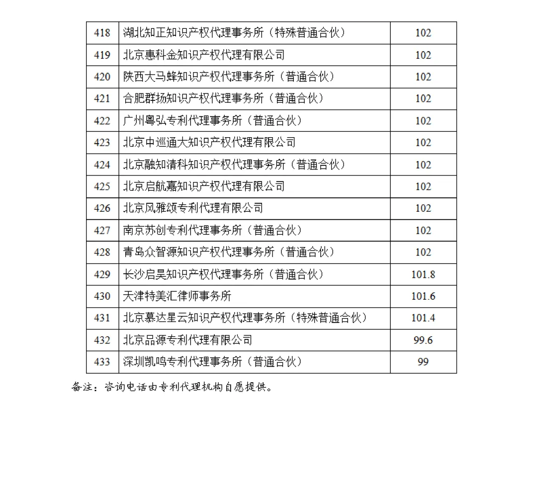 根据南昌市知识产权保护中心(以下简称南昌保护中心)关于印发《注册专利代理机构积分评价与奖励细则》(修订版)(洪知保〔2024〕20号)的通知精神,2025年全年共有433家专利代理机构在南昌保护中心获得积分,经统计并征询上述单位意见,现将专利代理机构积分排名结果予以公告。