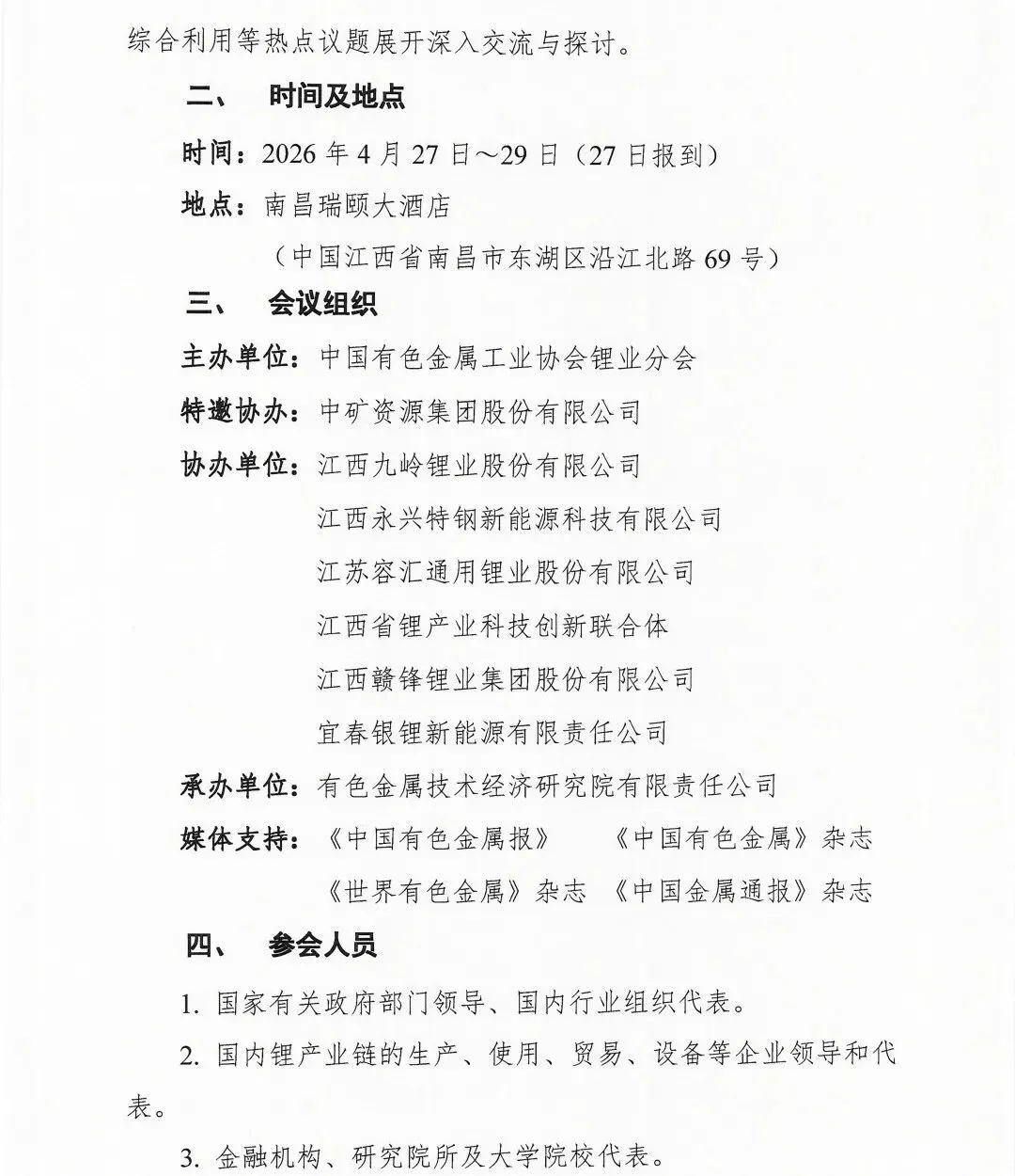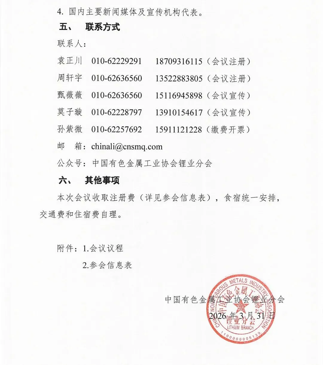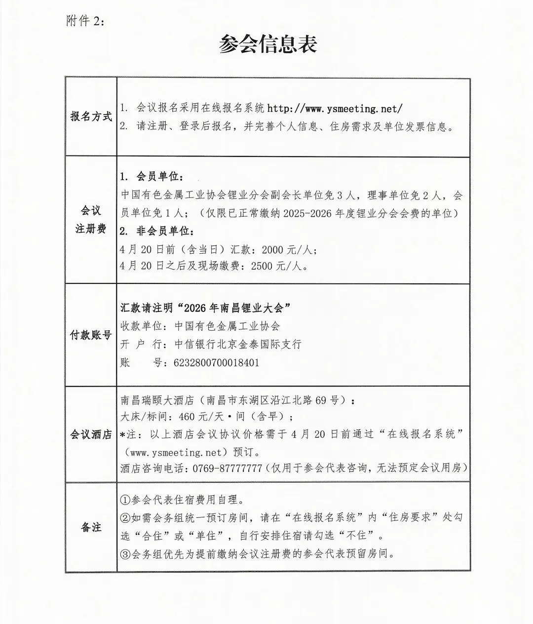 中国有色金属工业协会锂业分会副会长单位免3人,理事单位免2人,会员单位免1人。超出以上减免人数的会员单位及非会员单位参会代表收取会议费(含会议资料费和餐费),交通费和住宿费自理。