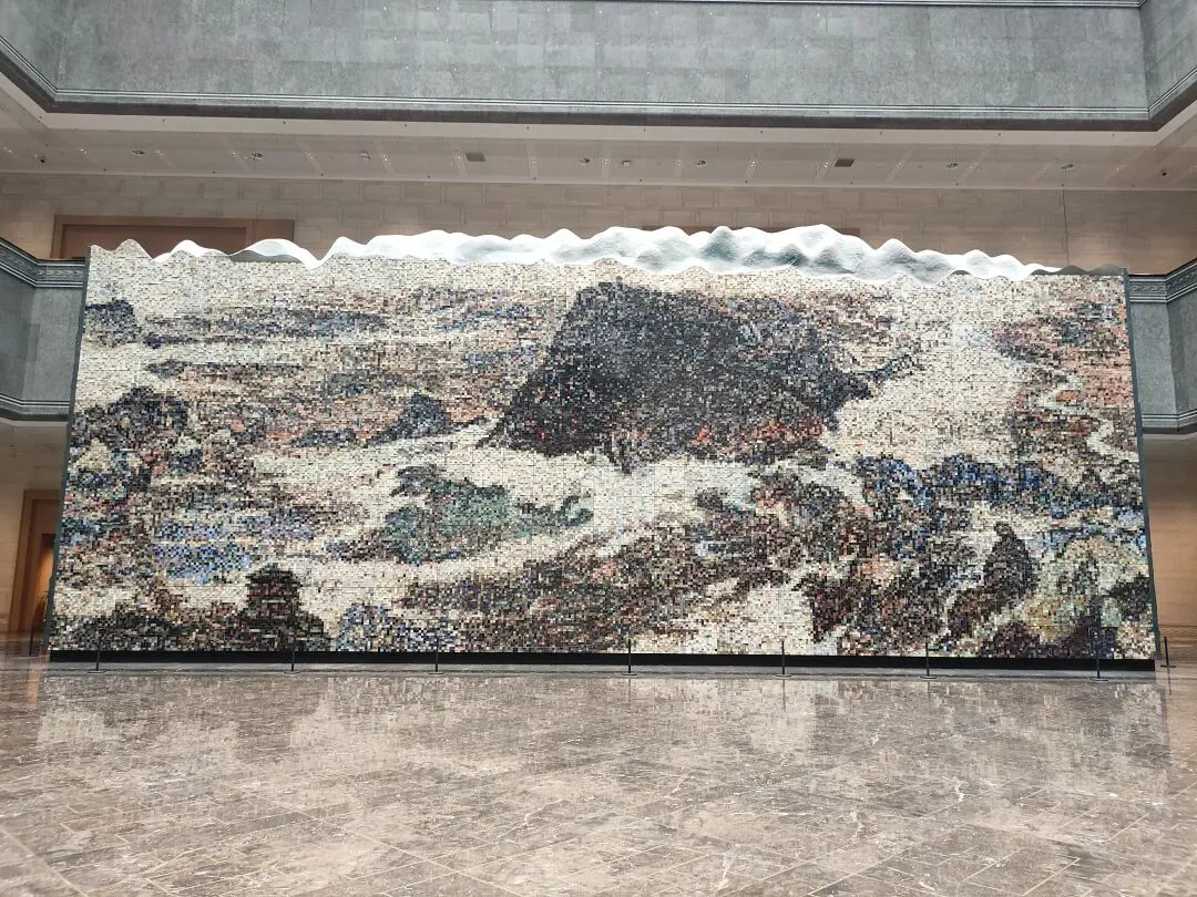 生态展馆展出了外国人贝林捐给博物馆的两百多件虎、羚羊、猴子等的标本;现代陶瓷馆展出许多景德镇陶瓷,时代进展,陶瓷的绘画更加丰富精美绝伦,雕塑也更多姿多彩,瓷板画更是别致。下图是大厅的巨幅陶瓷壁画,呈现庐山、井冈山、三清山等名山,还有滕王阁、赣江、鄱阳湖等胜景。