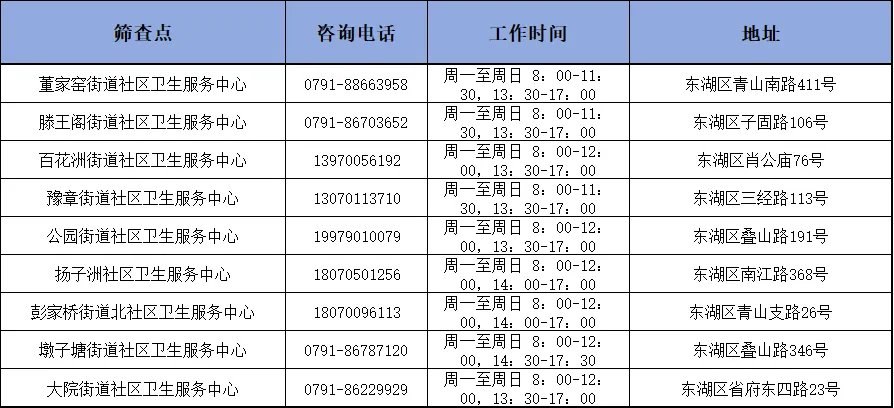 南昌市8个城区的54个筛查点信息