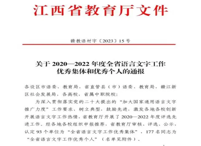 根据江西省教育厅《关于评选2020-2022年度语言文字工作先进集体和先进个人的通知》,经学校申报,省教育厅审核、评选、公示,南昌市第二十八中学喜获2020-2022年度全省语言文字工作优秀集体称号。