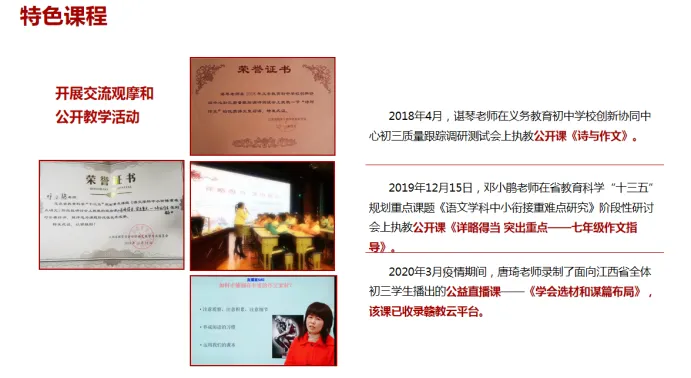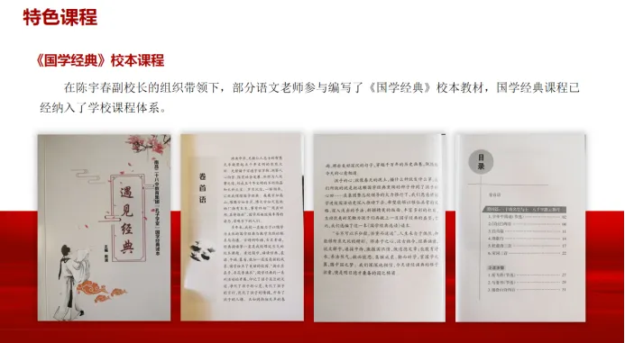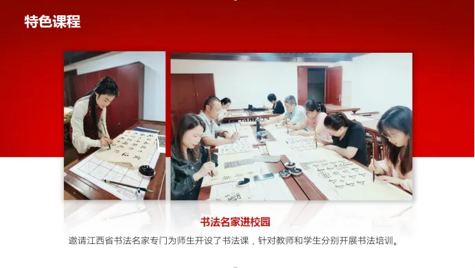 学校十分重视中华经典和优秀语言文化特色课程建设,专门组织老师编写了《国学经典》校本教材,国学经典课程已经纳入了学校课程体系。学校还十分重视书法特色课程建设,邀请江西省书法名家专门为师生开设了书法课。此外,依托名校效应,学校经常面向校外开展与语言文字应用相关的交流观摩和公开教学活动。