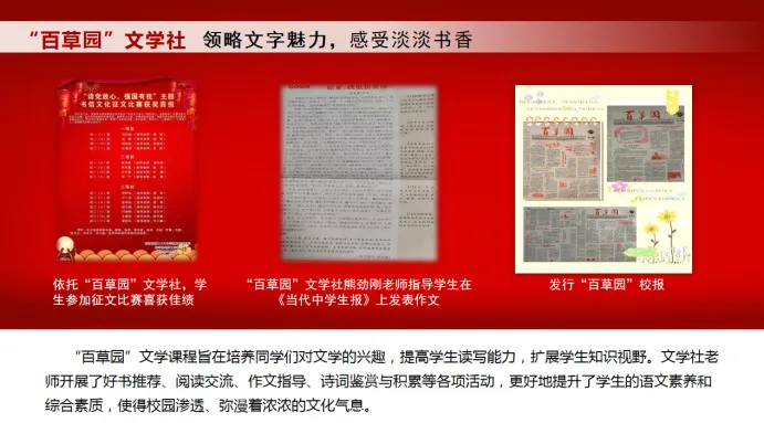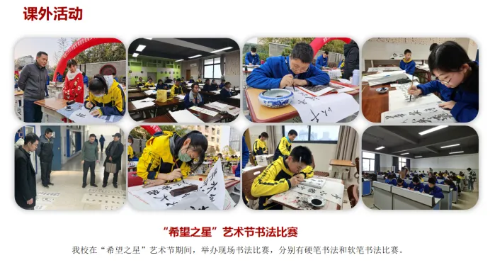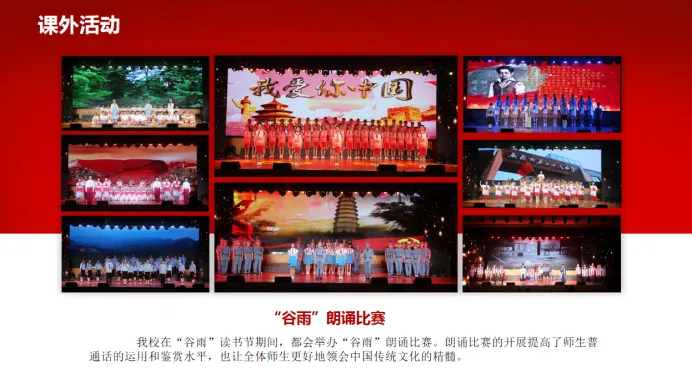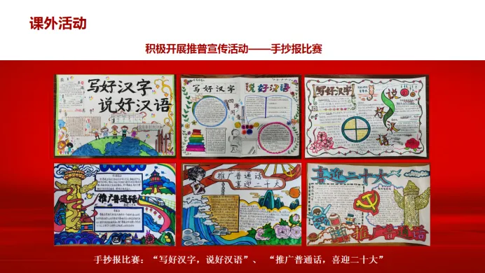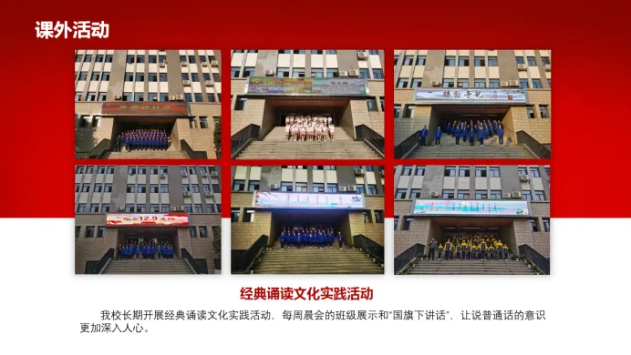 学校积极创造有利于语言文字工作的环境,引导学生在愉快学习中热爱语言、感受语言、运用语言,并认真组织各项活动,使之落实到位。学校建立了与语言文字工作密切相关的学生社团,课内外实践活动丰富多彩,形式多样。语言文字工作相关的社团和选修课程有:“叠山诗苑”、“课本中的诗人”、“百草园”文学社、播音主持社、硬笔书法社等。学校长期开展经典诵读、书法文化实践活动,如晨会班级诵读展示、“谷雨”朗诵、演讲比赛、“希望之星”现场书法比赛,积极开展推普竞赛活动,如手抄报比赛、汉字听写大赛。此外,学校每年都会组织学生参加南昌市教育局、南昌市语委组织的朗诵比赛、书法比赛等。