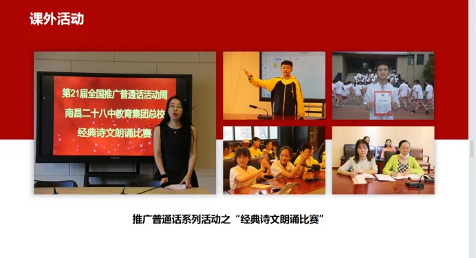 今后,学校将保持优势、继续努力、不断奋斗,积极贯彻“大力推行、积极普及、逐步提高”的方针,努力营造健康规范的校园语言文字环境,以“制度保障、课程提高、活动推进”作为语言文字工作的思路,有计划、有步骤地开展语言文字规范化工作,切实提高广大师生的语言文字应用能力和规范意识,始终以高度的热情开展语言文字工作,并不断借鉴和探索更有效的方法,推动学校语言文字规范化工作再上一个新台阶。来源:南昌二十八中教育集团总校(语文组)