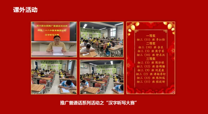 语言文字是先进文化建设的重要组成部分,是建设和谐社会的重要载体。南昌市第二十八中学作为南昌市名校,在充分利用和发挥学校教育的基础功能、提升社会用语用字规范方面有着义不容辞的责任和义务。学校深入贯彻《中华人民共和国国家通用语言文字法》,按照省、市语委办的要求,认真贯彻和落实“语言文字规范化工作”的有关法律和规定,并以“五育并举”和“双减”为大背景,充分利用现有资源,把语言文字工作与日常教育教学活动结合起来,与校园文化结合起来,并不断突破、不断创新,曾获得多项语言文字工作相关荣誉称号:中国中学生作文大赛作文教学先进单位、南昌市首批中小学语文学科教学研究基地,语文教研组被评为南昌市优秀教研组。